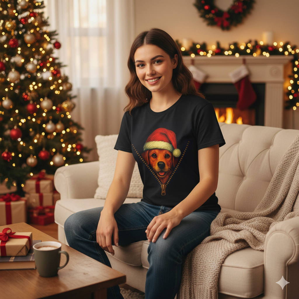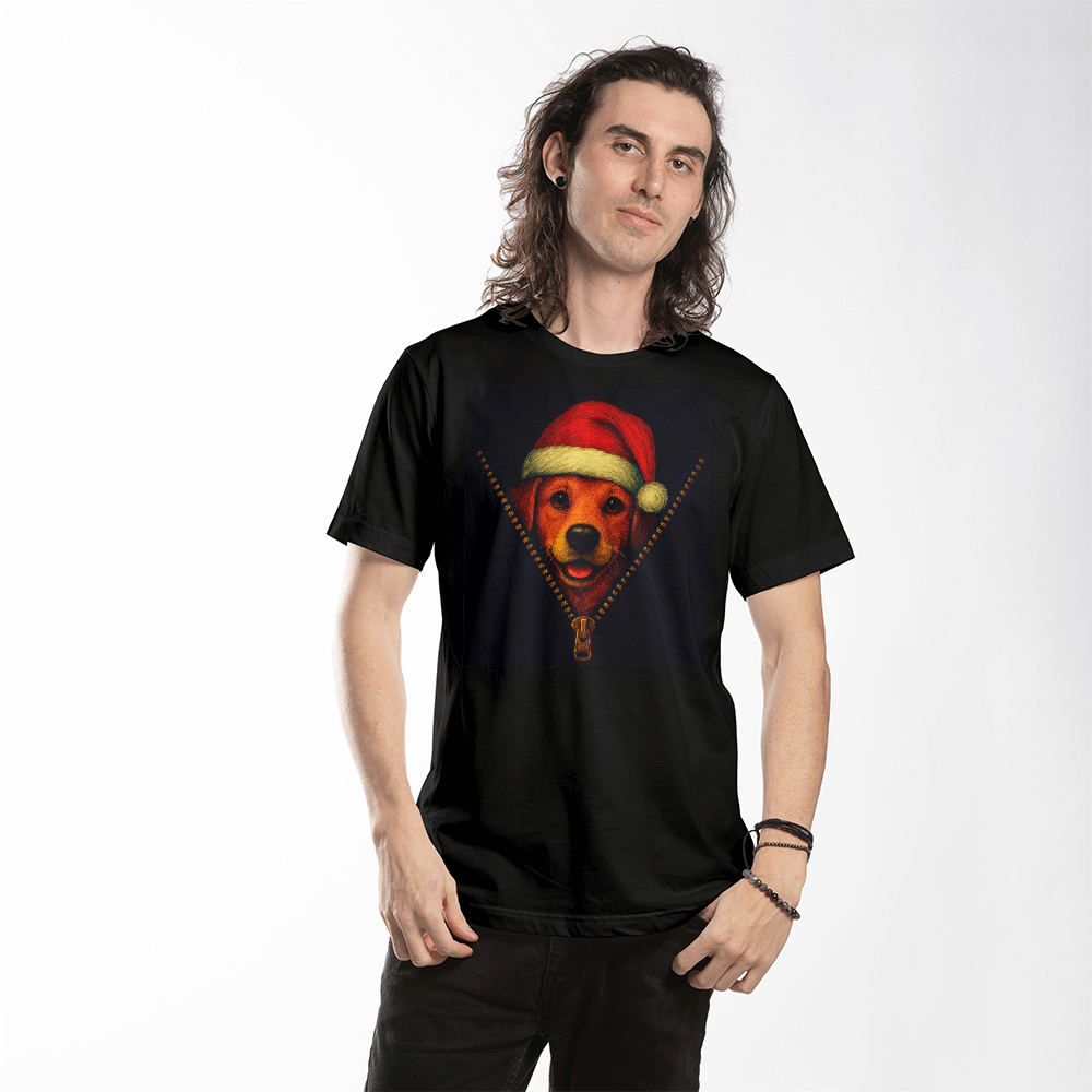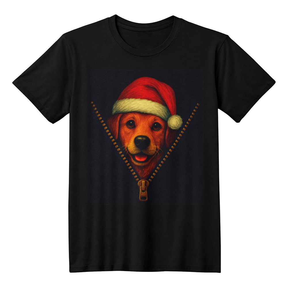 Celebrate the holidays in style with our Festive Santa Dog Christmas T-Shirt, featuring an adorable pup peeking through a playful “zip” design while wearing a classic Santa hat. Perfect for dog lovers and anyone who enjoys fun, festive fashion, this tee combines cozy comfort with irresistible holiday charm.