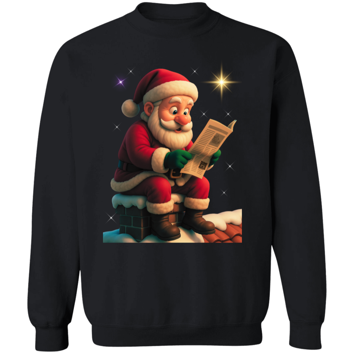 Bring holiday cheer and laughter to your festive wardrobe with this hilarious Santa Reading Newspaper Christmas Sweatshirt! Featuring a vibrant 3D-style illustration of Santa sitting on a snowy chimney, reading his newspaper under bright holiday stars, this cozy crewneck is guaranteed to turn heads and spark smiles.