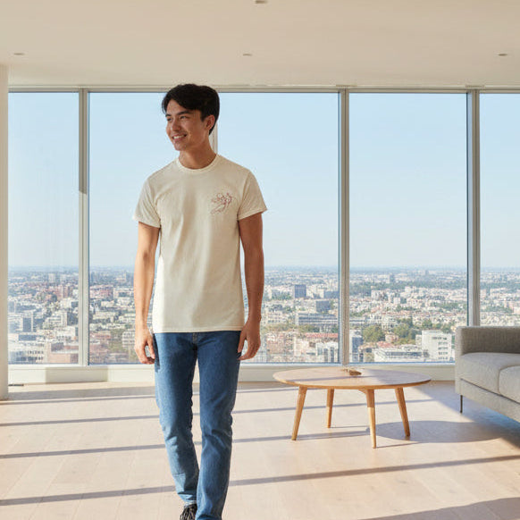 Crafted from 100% breathable cotton, the lightweight fabric is comfortable on warm days and layers effortlessly under jackets when the air cools. The minimalist chest artwork keeps the look refined and versatile, making it perfect for everyday wear — from coffee runs and sketch sessions to long walks where small details matter most.